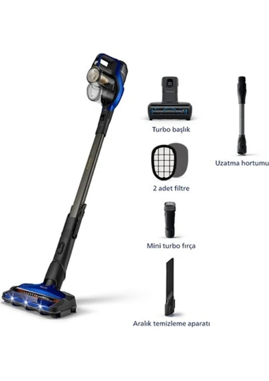 Teknik Nitelikler Filtreleme Filtre sistemi 3 aşamalı siklonik hareket Toz kapasitesi 0,6 -Litre(l) Performans Çalışma süresi 70 dakika(minute(s)) Şarj süresi 5 -Saat(hour(s)) Pil gerilimi 25,2 volt(V) Hava akımı (maks.) 1100 - Litre / dakika(l/min) Ses gücü seviyesi 84 desibel(dB) Pil tipi Lityum iyon Tasarım Renk Azur Ağırlık ve boyutlar Ürünün boyutları (UxGxY) 1170x260x220 milimetre(mm) Ağırlık 2,7 kilogram(kg) Sürdürülebilirlik Ambalaj > %90 geri dönüşümlü malzeme Kullanım kılavuzu %100 geri dönüştürülmüş kağıt Başlıklar ve aksesuarlar Ek başlık Mini turbo fırça Dahil olan aksesuarlar Uzatma hortumu Ek filtre 2'si 1 arada fırça/aralık temizleme aparatı Entegre fırça Aralık temizleme aparatı Standart başlık 360° emiş başlığı