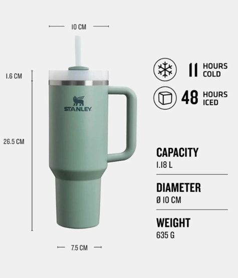 Benzersiz Isı Yalıtımı, Üstün Performans! Stanley Quencher seyahat termosu, günlük yaşamınızda, antrenmanlarınızda veya uzun iş günlerinde içeceklerinizi saatlerce soğuk tutabilmek için özel olarak tasarlandı. Quencher’ın kapağı, kullanım kolaylığı sağlayan üç farklı özelliğe sahip. Üç aşamalı çevrilebilir kapak tasarımı sayesinde hem pipetli hem de pipetsiz kullanılabilir, taşıma sırasında etrafa sıvı sıçramasını önlemek için ise pipeti çıkararak kilitli konuma getirebilirsiniz. Stanley Quencher, araç bardaklıklarıyla uyumludur. Ergonomik ve sağlam bir kulp tasarımına sahiptir. Stanley, kullanımı daha rahat getiren ve hayatı kolaylaştıran çözümler yaratarak sektöre öncülük etmekle kalmıyor aynı zamanda gün boyu yiyecek ve içecek ihtiyacınızı karşılamak için muhteşem teknolojiler yaratmaya devam ediyor. Üstelik Stanley, ürünlerinin vaatlerini yerine getireceğini garanti ediyor. Tüm ürünlerimiz üretim kaynaklı sorunlar için tabi ki garanti altında. Kapak tasarımı sıçramaları en aza indirecek şekilde tasarlanmıştır. Pipet ile kullanımın doğası ve kapak yapısının şekli nedeni ile Stanley Quencher yan veya ters çevrildiği zaman pipet kısmından veya kapak kilitli konumda iken akıtma yapabilir. Stanley Termos Ürün Özellikleri 90% geri dönüştürülmüş, 18/8 paslanmaz çelik, BPA içermez. Bardağın iç kısmında göreceğiniz geri dönüştürülmüş paslanmaz çelik amblemi, termosunuzun sürdürülebilir malzemelerden yapıldığını gösterir. Çift duvarlı vakumlu yalıtım. Mat boya kaplama. FlowState™ 3 aşamalı çevrilebilir kapak. Tekrar kullanılabilir pipet. Rahat tutuş sağlayan kulp. Araba bardaklığı ile uyumlu (Taban çapı: 7,9 cm). Bulaşık makinesine girebilir ancak elde yıkama tavsiye edilir. Stanley Termos Teknik Özellikleri Kapasite: 1,18Lt. Boyutlar: Yükseklik 7,5 cm, Genişlik 10 cm, Uzunluk 26,5 Sıcak: 7 saat Soğuk: 11 saat Buzlu İçecekler: 48 saat