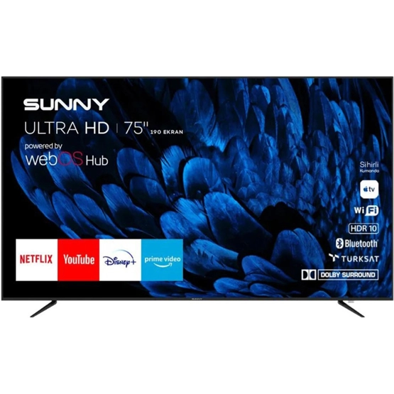 Sunny SN75LEDB252 4K Ultra HD 75" 190 Ekran Uydu Alıcılı webOS Smart LED TV / 75'' 190 Ekran / 3840 x 2160 Ultra HD / LGE WebOS 2.0 İşletim Sistemi / HDR Teknolojisi ile 10 Bit Renk / Dolby Audio / En Zengin Uygulama Desteği / SPDIF Dijital Ses Çıkışı / Ram: 1.5 GB Dahili / Rom: 8 GB / DVB-T2/C/S2 Yayın Desteği / WIFI 2,4 GHz / 5 GHz / 2 x 8 W Ses Çıkışı / 2 x USB (Media Player) - 3 x HDMI / Sihirli Kumanda / Apple Home Desteği / Apple Music ve Apple TV Desteği / Apple Airplay Desteği / Bluetooth 5.1 / Tek Kumanda / Garanti Süresi: 3 Yıl Sunny Garantili