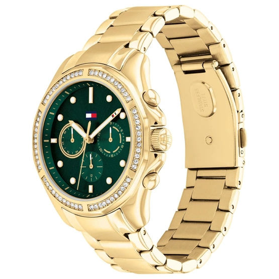 Kasa Çapı: 41 mm - Kasa Şekli: Yuvarlak - Kasa Materyali: Çelik - Kasa Rengi: Altın Rengi - Kordon Materyali: Çelik - Kordon Rengi: Altın Rengi- Kadran Rengi: Yeşil - Kadran Işığı: Yok - Taş: Var - Çalışma Şekli: Analog - Teknolojisi: Quartz - Takvim: Var - Kronometre: Yok - Alarm: Yok - Cam Özelliği: Mineral - Özellik: Fonksiyonlar: 24 Saat, Gün - Su Geçirmezlik: 5 ATM - Garanti Süresi: 2 YIL - Cinsiyet: Kadın